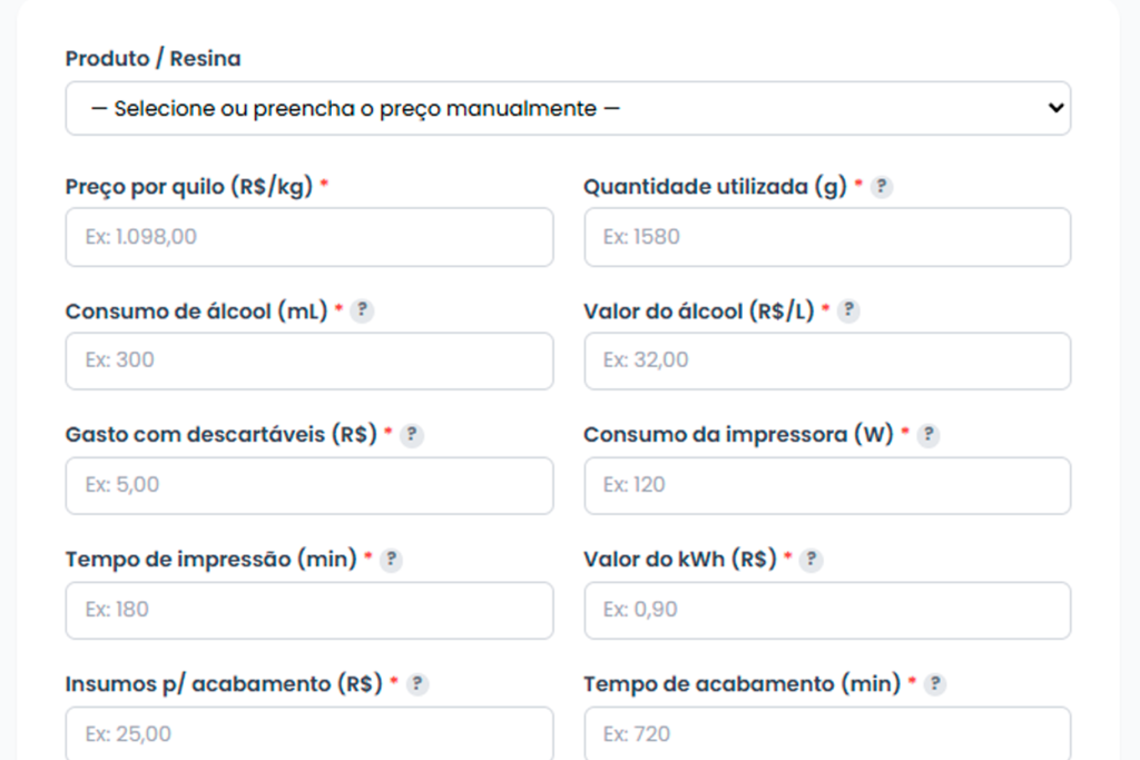 No campo Produto/ Resina você pode selecionar a resina 3D CURE que você utiliza, assim o cálculo já vai considerar automaticamente o valor pago no quilo (kg) da resina. A quantidade de resina utilizada em gramas (g) você encontra no seu fatiador.