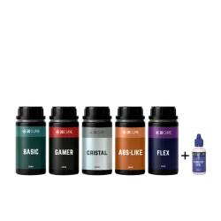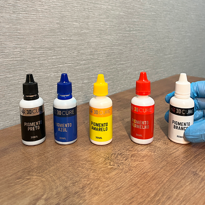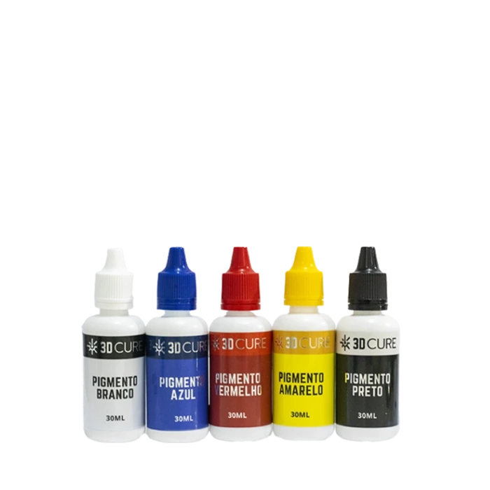 Os pigmentos para resina 3D da 3D Cure foram desenvolvidos para colorir resinas utilizadas em impressoras 3D. Disponíveis nas cores preto, branco, azul, amarelo e vermelho, são fornecidos em frascos de 30 mL, prontos para uso. Podem ser adquiridos individualmente ou em kit com as cinco cores.