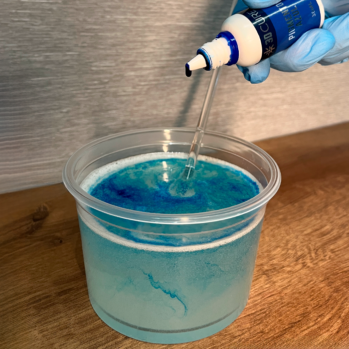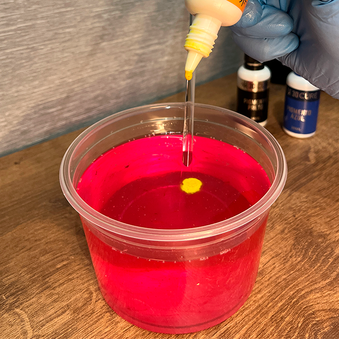 Em um copo descartável de 200 mL, acrescente 150 g de resina (~75% do volume), pingue o pigmento e misture com uma colher descartável ou palito de picolé.