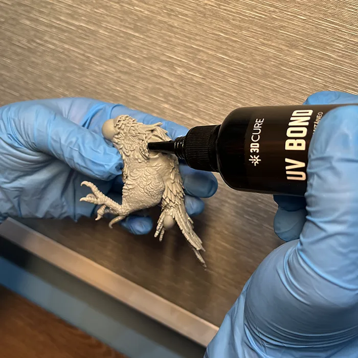 Para colar grandes peças opacas, associe o adesivo UV Bond a outros materiais para impressora 3D, aplicando o UV Bond nas extremidades e adesivos convencionais na parte interna. Assim, o UV Bond realiza a fixação imediata das bordas, enquanto o outro adesivo atua internamente no tempo necessário.